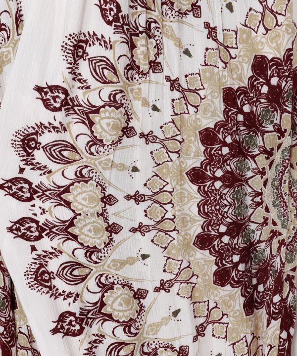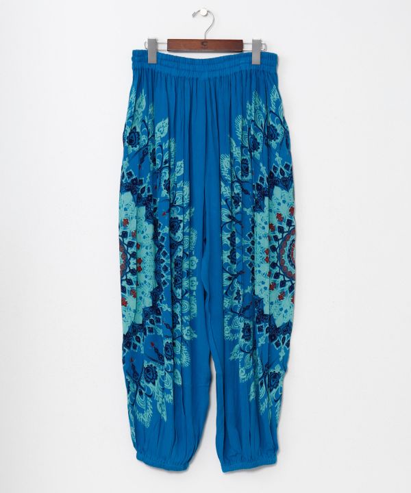 大胆なマンダラ柄が印象的なアラジンパンツ。リゾート気分を演出するゆったりシルエットとレーヨンクレープ素材の落ち感が魅力。