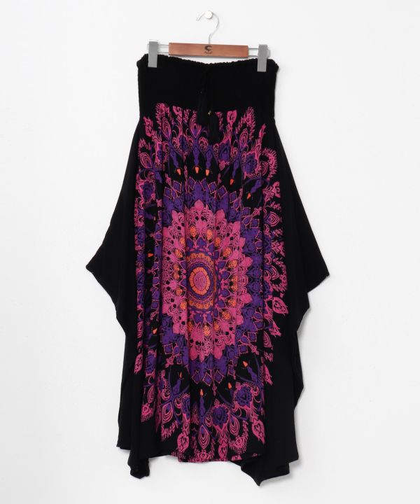 マンダラ柄の変形スカート。軽やかなレーヨン素材で、動くたびに揺れるシルエットがリゾートスタイルに映える一枚。