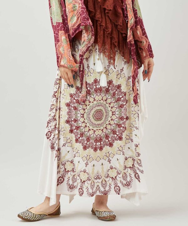マンダラ柄の変形スカート。軽やかなレーヨン素材で、動くたびに揺れるシルエットがリゾートスタイルに映える一枚。