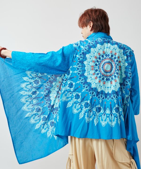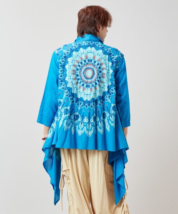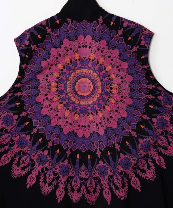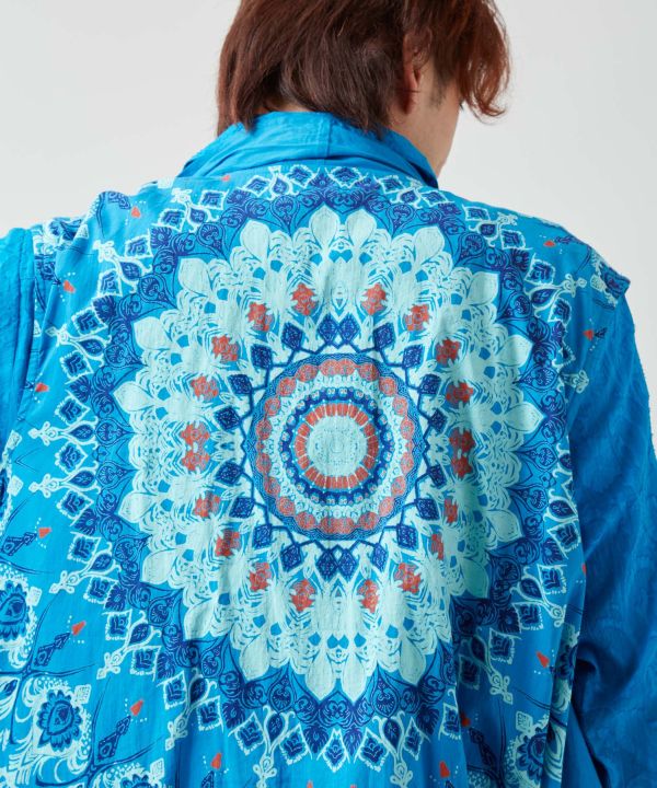 マンダラ柄をプリントしたベスト型変形カーデ。レイヤードに最適で、ユニセックスで着用可能。インド綿でさらっと快適。