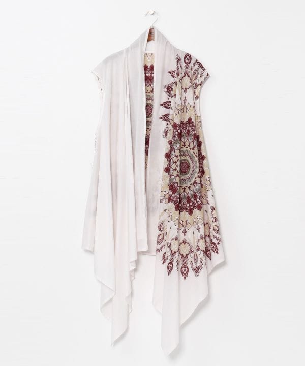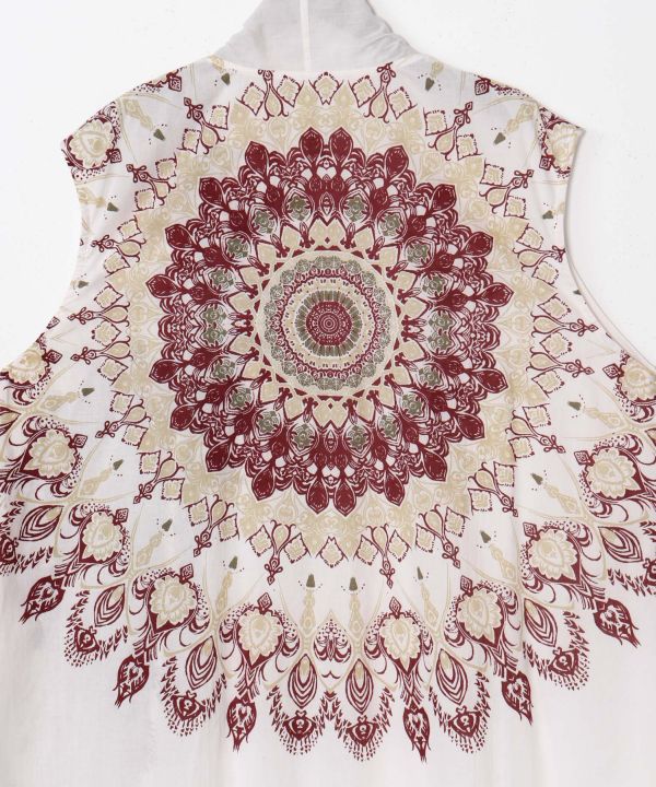マンダラ柄をプリントしたベスト型変形カーデ。レイヤードに最適で、ユニセックスで着用可能。インド綿でさらっと快適。