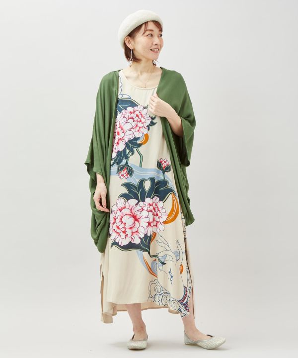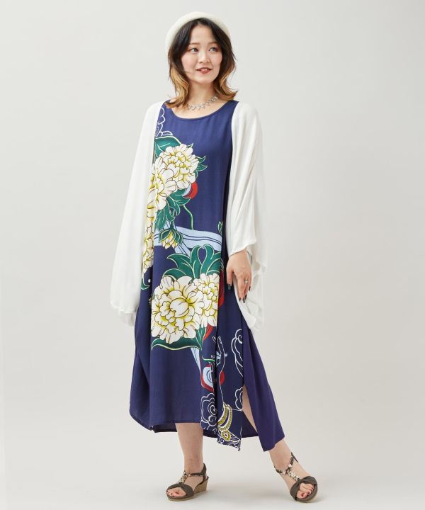 柄ワンピースとカーディガンのセット。チベット仏教の仏画掛軸「タンカ」のエッセンスや吉祥文様を配し、UV加工付きカーデで実用も兼ね備えた組み合わせ。