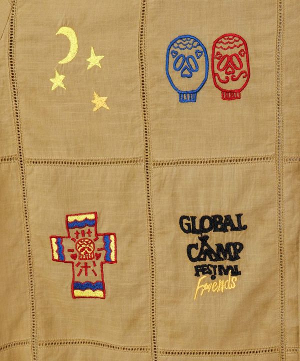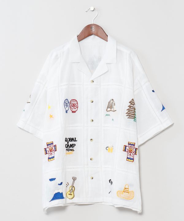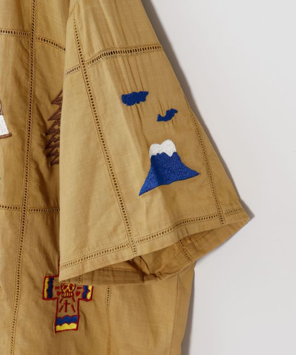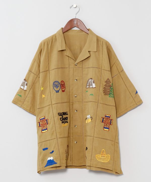 【Amina×grn×ogawa】アウトドアの世界観を刺しゅうで表現した開襟シャツ。自然と繋がる外遊びを楽しむカジュアルなTシャツ。