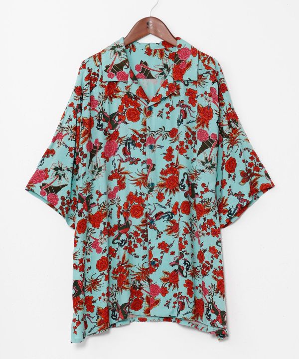 旅するカラベラが、タイの水かけ祭り「ソンクラーン」楽しんでいる様子を描いた開襟シャツ。レーヨン素材でさらっと着られ、マリーゴールドやタイの国花ラーチャプルックをボヘミアンな雰囲気で散りばめた一枚。