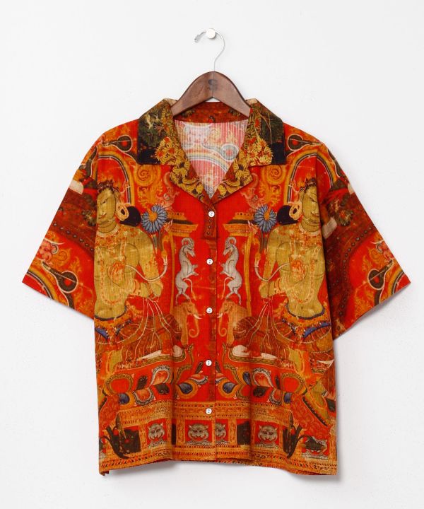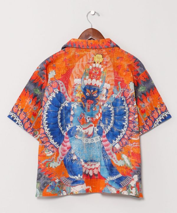 チベットの宗教画「タンカ」を大胆にプリントした総柄シャツ。肌なじみの良いコットン素材で着心地快適。着るだけでアートを感じられるデザイン。