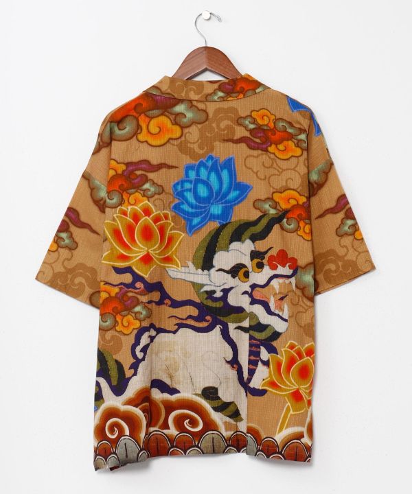 チベット仏教の仏画の掛軸「タンカ」を大胆にプリントしたメンズシャツ。肌触りの良いコットン生地は通気性も抜群。チベットの精神性とアートを纏う唯一無二の一枚。