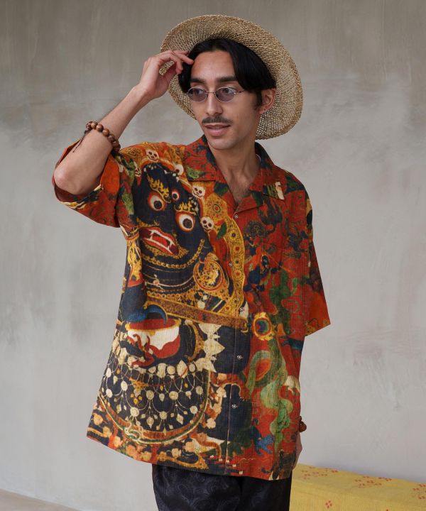 チベット仏教の仏画の掛軸「タンカ」を大胆にプリントしたメンズシャツ。肌触りの良いコットン生地は通気性も抜群。チベットの精神性とアートを纏う唯一無二の一枚。