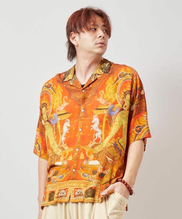 チベット仏教の仏画の掛軸「タンカ」を大胆にプリントしたメンズシャツ。肌触りの良いコットン生地は通気性も抜群。チベットの精神性とアートを纏う唯一無二の一枚。