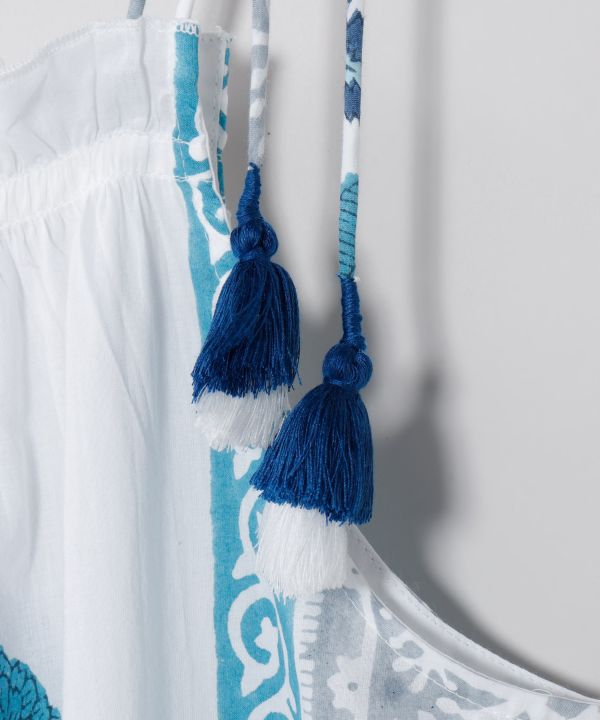 インドの伝統技法ブロックプリントを贅沢に使用したワンピース。大きな柄とボヘミアンな色合いが目を惹く一枚。肩紐は調節可能で着心地も快適。