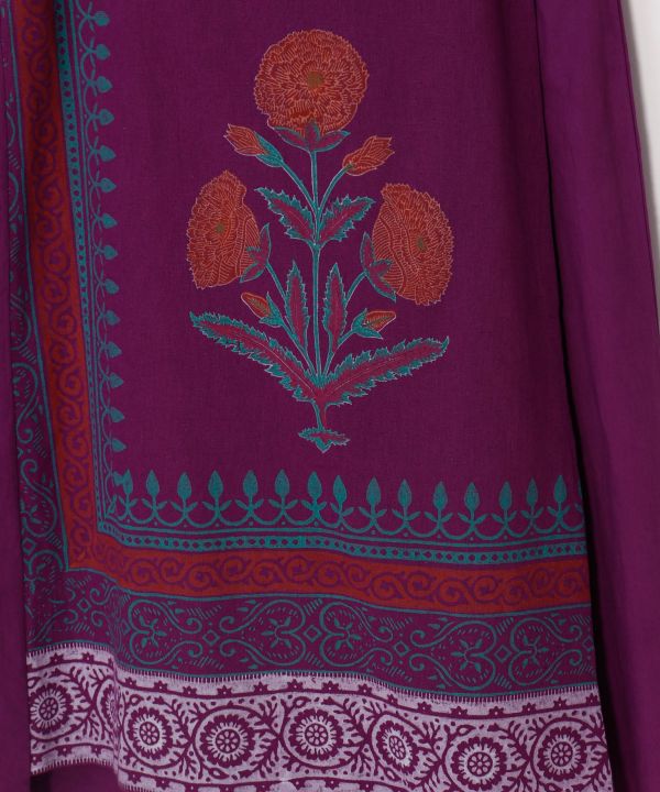 インドの伝統技法ブロックプリントと無地のバランスが絶妙な巻きパンツ。大きな柄とボヘミアンな色合いがコーデを彩る。背面は無地で、コーデしやすいのも魅力。