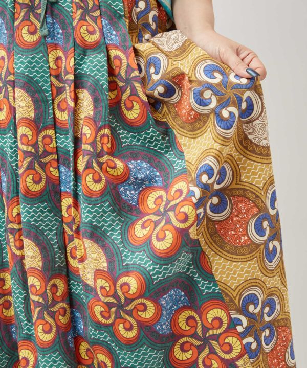 キテンゲ柄を現代風にアレンジしたボリューミーなスカート。たっぷりのタックで動くたびに揺れるシルエットが印象的。ウエストはゴム仕様で着心地も抜群。鮮やかな色合いがコーディネートの主役に。
