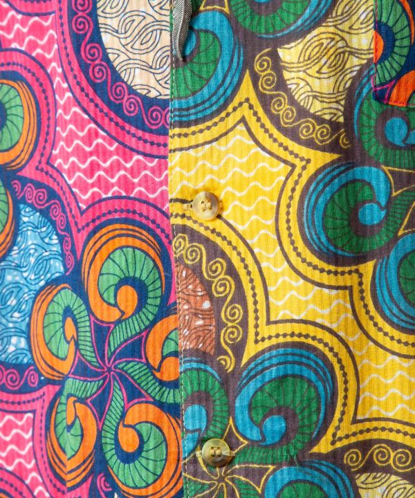 存在感のあるパッチワーク風メンズシャツ。アフリカの伝統布キテンゲをモチーフにした、エネルギッシュな色彩が魅力のデザイン。通気性のよい織り生地で暑い季節にも快適。
