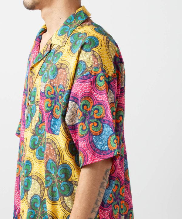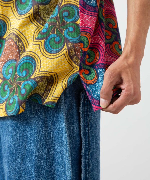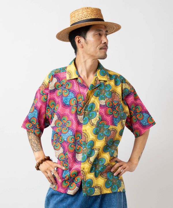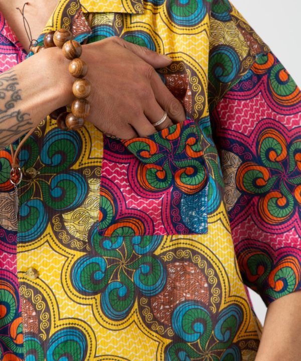 存在感のあるパッチワーク風メンズシャツ。アフリカの伝統布キテンゲをモチーフにした、エネルギッシュな色彩が魅力のデザイン。通気性のよい織り生地で暑い季節にも快適。