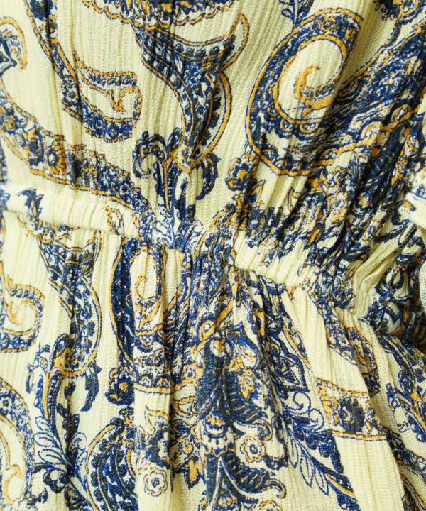 ペイズリー柄を大胆にプリントしたトップス。落ち感あるレーヨン素材で、スタイルアップを演出する主役級アイテム。