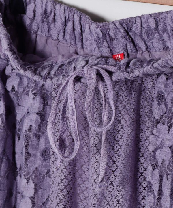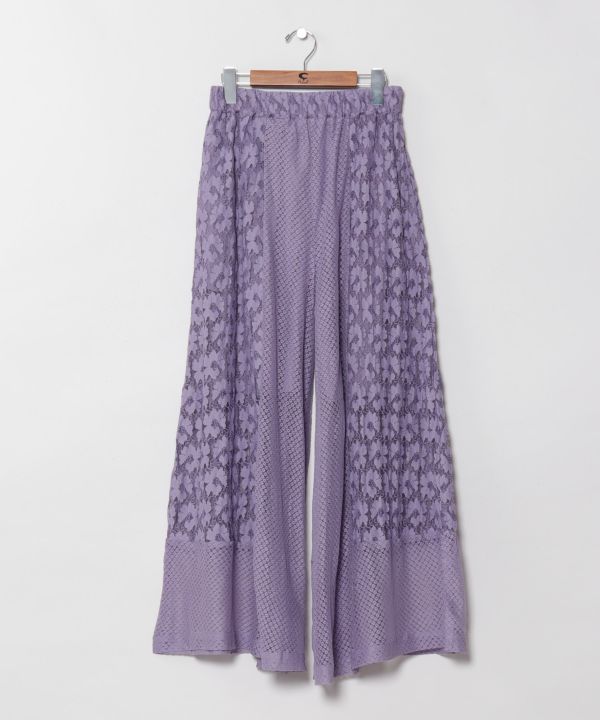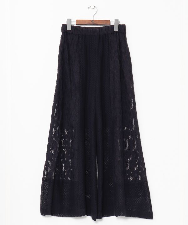 3種のレースと刺しゅう生地を組み合わせたクラフト感のある切り替えパンツ。裏地付きで透けず、ワイドシルエットで美脚効果も。