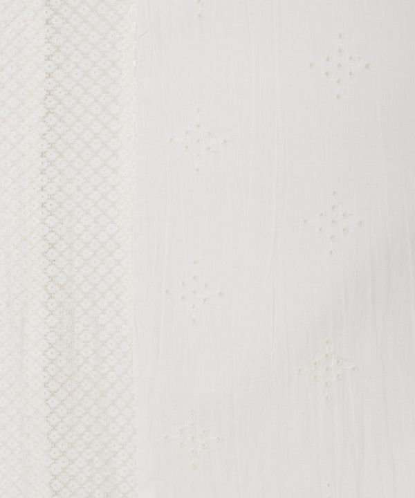 3種のレース生地と総柄刺しゅう生地を組み合わせた開襟シャツ。クラフト感あふれる切り替えデザインで涼しく着られる。
