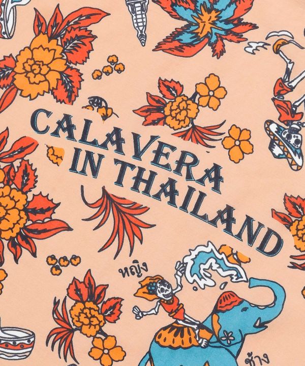 タイの水かけ祭り「ソンクラーン」を楽しむ旅するカラベラの姿を描いたバンダナ。やわらかな綿素材で巻きやすく、通常より大きめな60cm角の使いやすいサイズ感も魅力。