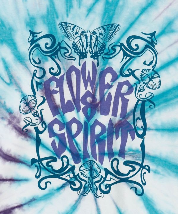 ヒッピームードあふれるタイダイ柄のメンズTシャツ。古着のような風合いとすっきりシルエットで着こなしやすい一枚。蝶々、バス、きのこが主役の個性派デザイン。