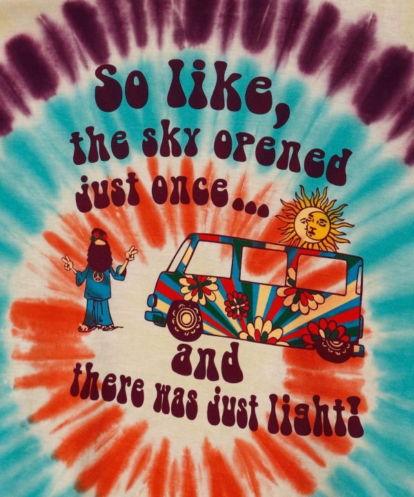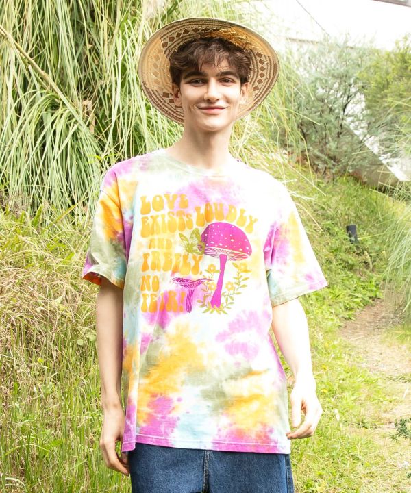ヒッピームードあふれるタイダイ柄のメンズTシャツ。古着のような風合いとすっきりシルエットで着こなしやすい一枚。蝶々、バス、きのこが主役の個性派デザイン。