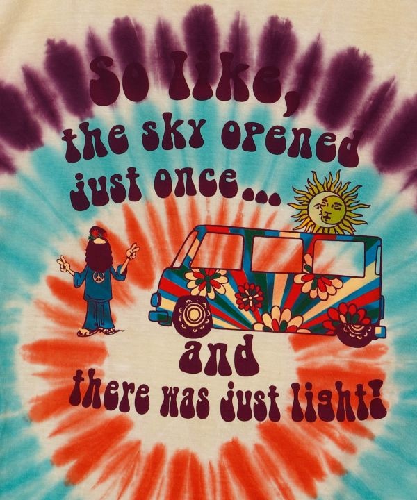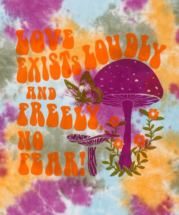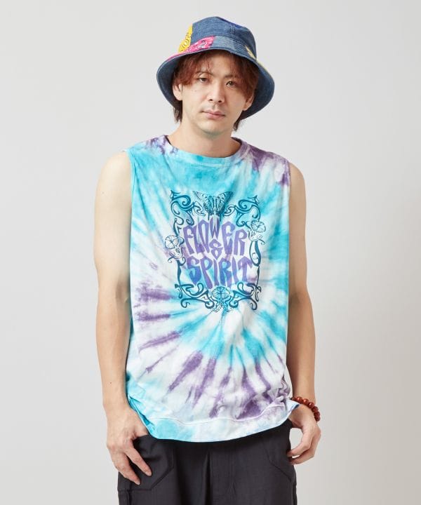ヒッピームードあふれるタイダイ柄のメンズタンクトップ。古着感のある色合いとボックスシルエットで一枚でもきまる。蝶々・バス・きのこをモチーフにした3柄展開。