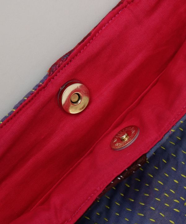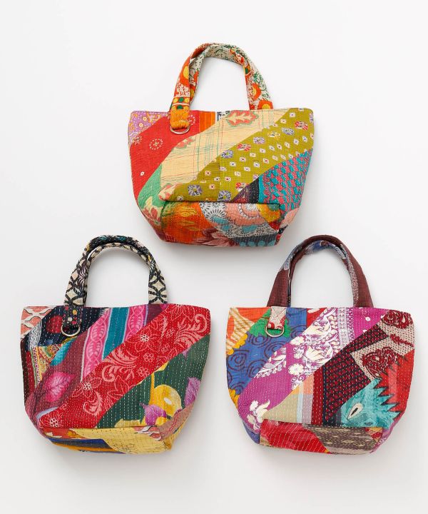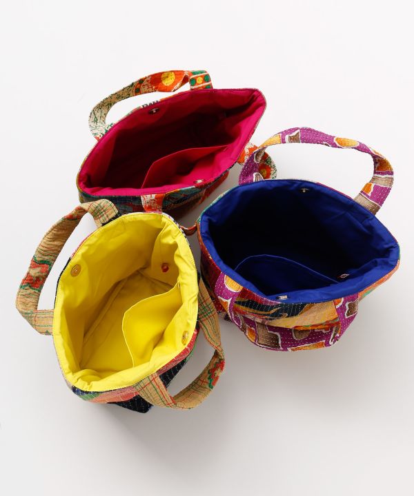 歴史をまとったインドの古布に刺し子ししゅうを施したトートバッグ。一点一点異なるアソート生地を使用し、手仕事のあたたかみと風合いが魅力のバッグです。裏地がそれぞれブルー、イエロー、ピンクになっています。