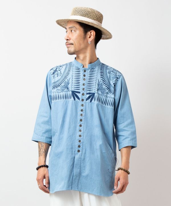 藍染ジャケットを彷彿とさせるロングシャツ。中国の「ミャオ族」の伝統工芸ろうけつ染をイメージしたプリント。インディゴ染めの深みと広がるシルエット。民族衣装の魅力をモダンに表現。