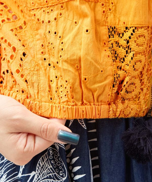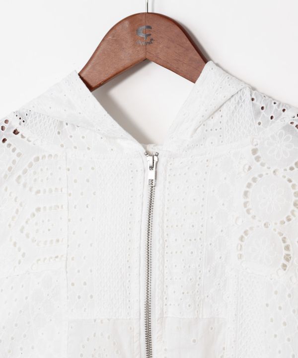 刺しゅうとレースの豪華パッチワークが目を惹くパーカーカーデ。ジップ開きで着脱も楽ちん。軽く羽織るだけで主役になれる存在感のある一枚。
