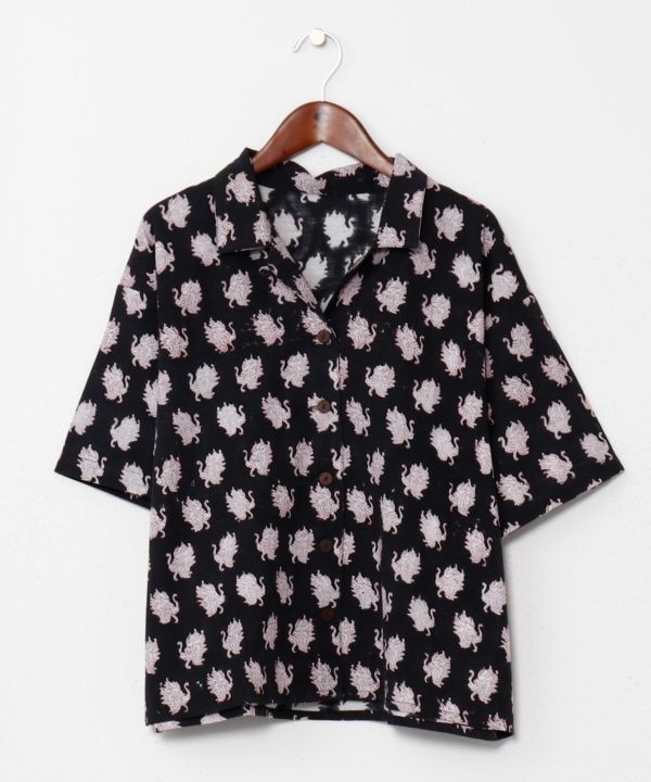チベットの宗教画「タンカ」をヘタウマなイラスト風にした開襟シャツ。個性的な柄と柔らかな着心地で人と被らないスタイルに。