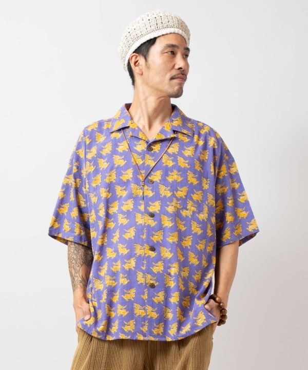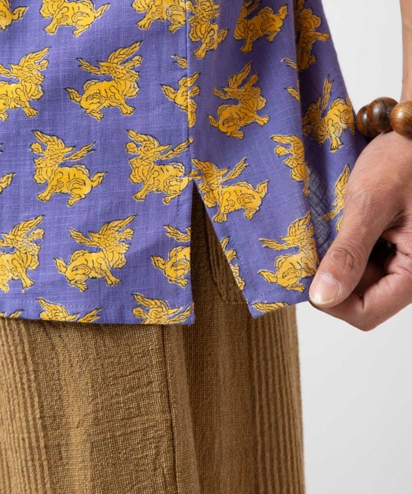 チベットの宗教画「タンカ」をヘタウマなイラスト風にした開襟メンズシャツ。インドのブロックプリント技法で味わい深い風合いに。