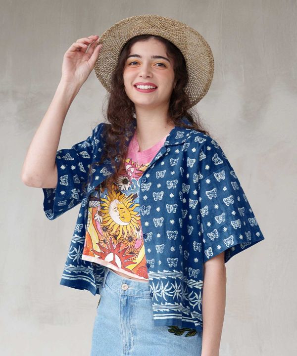 短丈でバランスが取りやすい開襟シャツ。インディゴの深みあるカラーと繊細なブロックプリントが調和し、カジュアルにも映える万能アイテム。