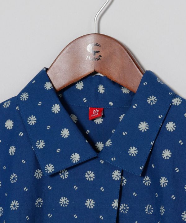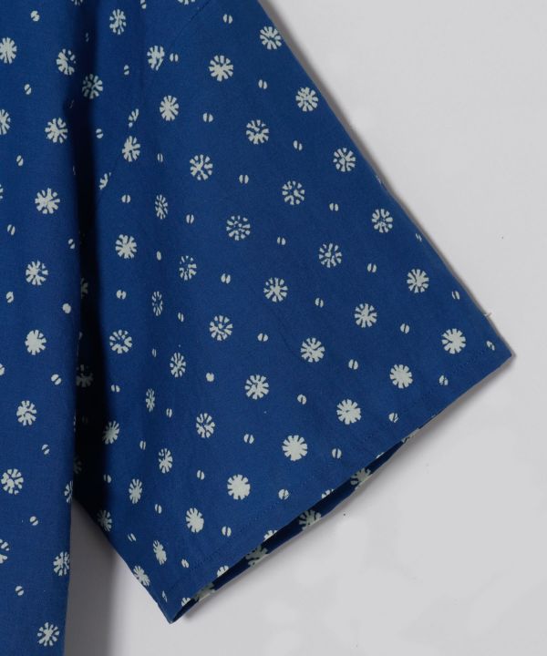 短丈でバランスが取りやすい開襟シャツ。インディゴの深みあるカラーと繊細なブロックプリントが調和し、カジュアルにも映える万能アイテム。