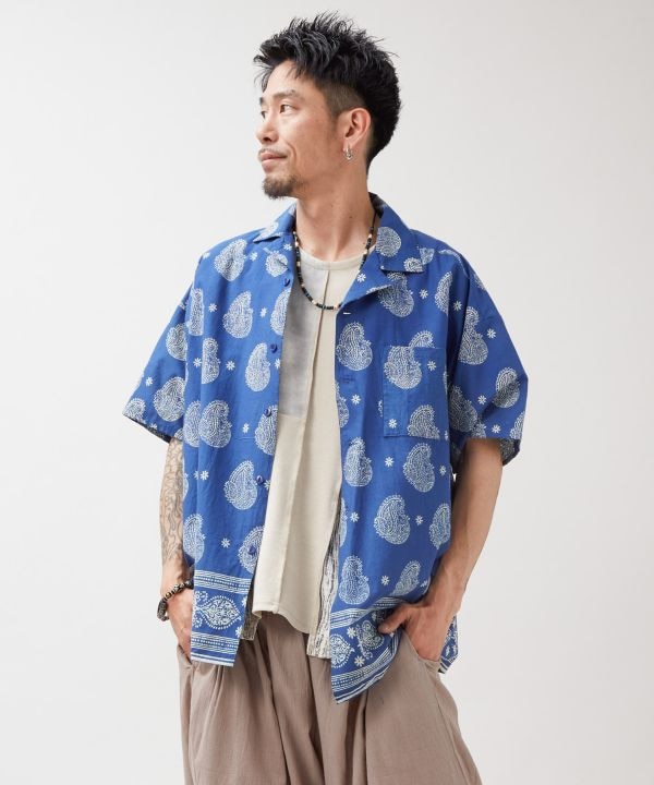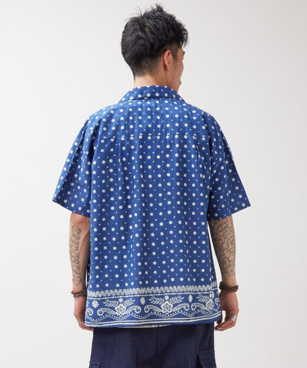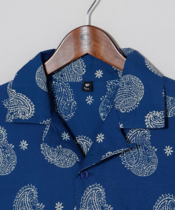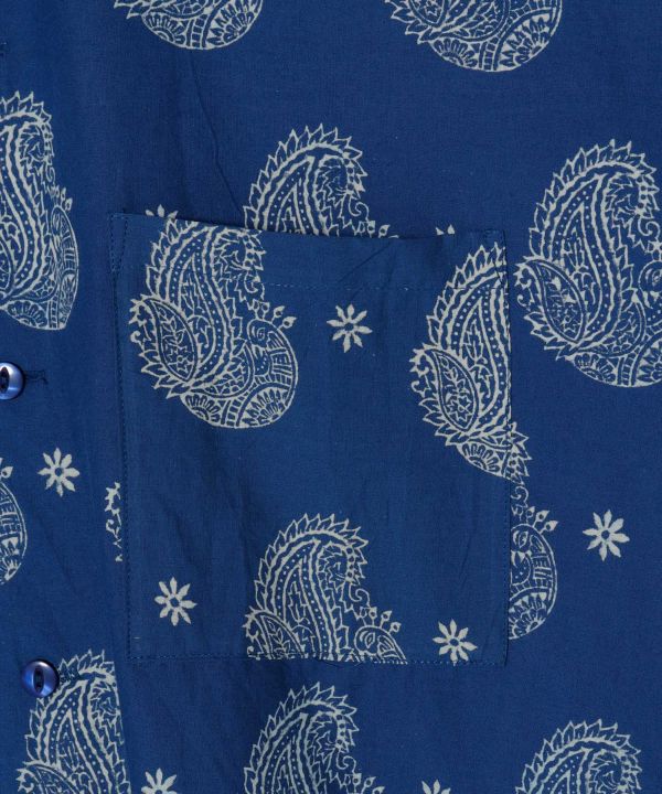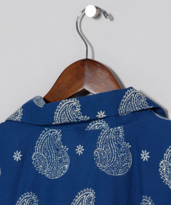 藍色が映えるブロックプリントの開襟シャツ。ゆったりオーバーサイズでリラックス感抜群。インドの職人技が光る上品な一枚。