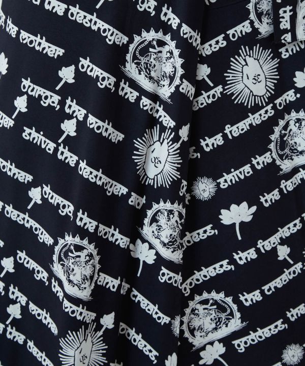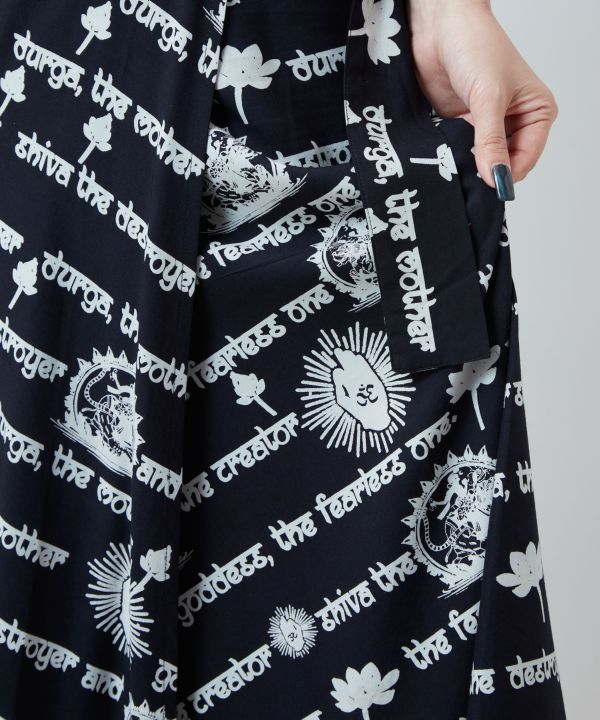 インド神話をモチーフにしたプリントスカート。巻きスカート仕様で着こなし自由自在。落ち感のあるレーヨン素材で美しいシルエットに。
