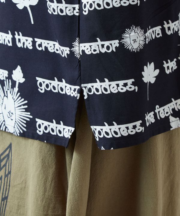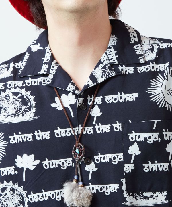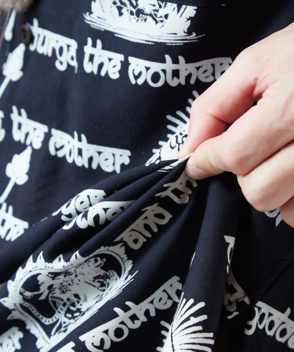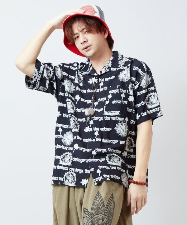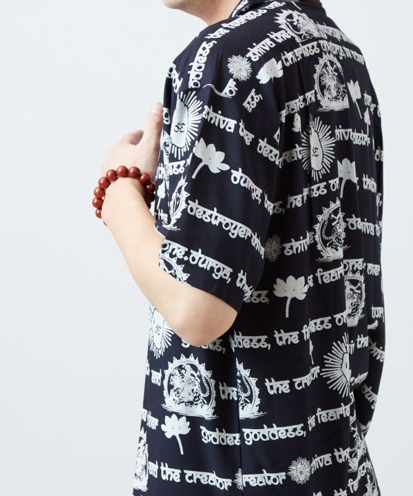 神々を描いたアートのような開襟シャツ。落ち感のあるレーヨン素材が優しくフィットし、存在感のあるプリントがコーデの主役になる一枚。