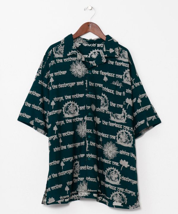 神々を描いたアートのような開襟シャツ。落ち感のあるレーヨン素材が優しくフィットし、存在感のあるプリントがコーデの主役になる一枚。