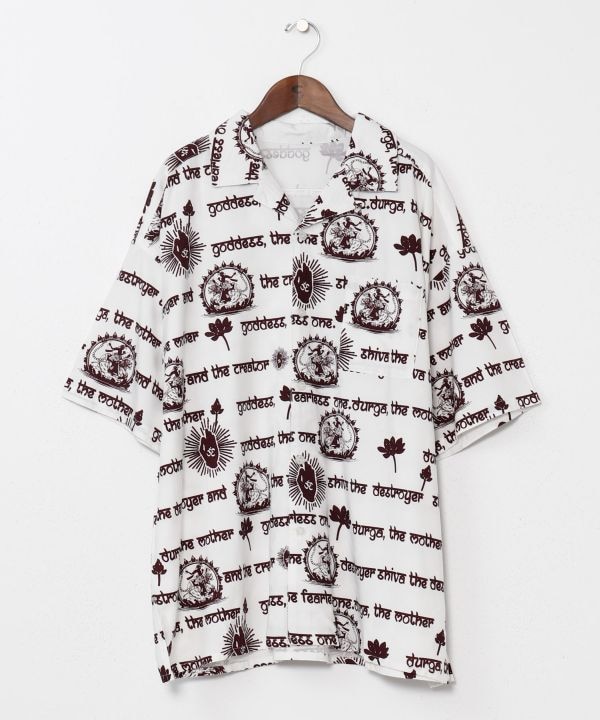 神々を描いたアートのような開襟シャツ。落ち感のあるレーヨン素材が優しくフィットし、存在感のあるプリントがコーデの主役になる一枚。
