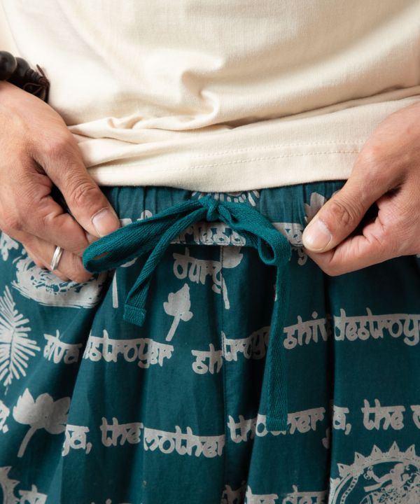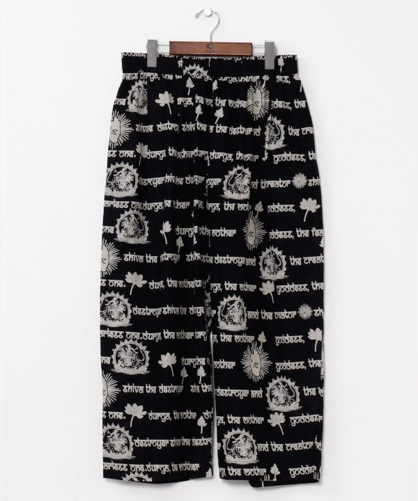 シヴァ神とドゥルガー神が描かれたインド綿のプリントパンツ。インパクトあるデザインと涼やかな素材感が魅力。ウエスト内紐付きで調整可能。