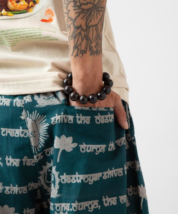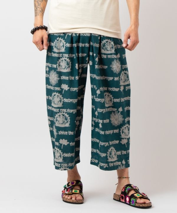 シヴァ神とドゥルガー神が描かれたインド綿のプリントパンツ。インパクトあるデザインと涼やかな素材感が魅力。ウエスト内紐付きで調整可能。