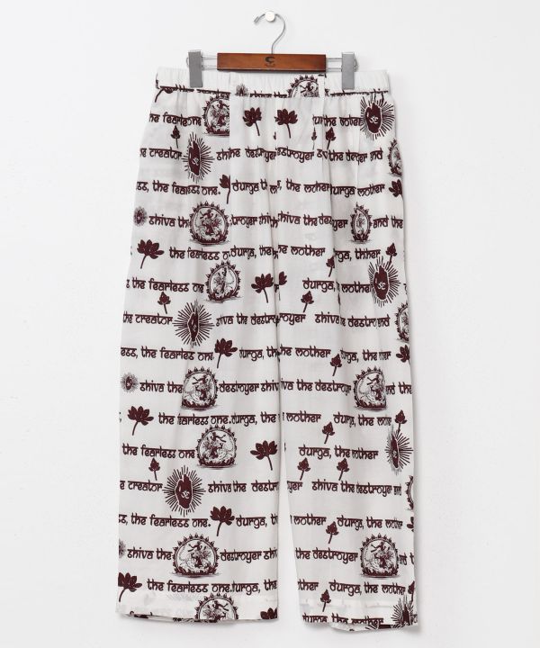 シヴァ神とドゥルガー神が描かれたインド綿のプリントパンツ。インパクトあるデザインと涼やかな素材感が魅力。ウエスト内紐付きで調整可能。