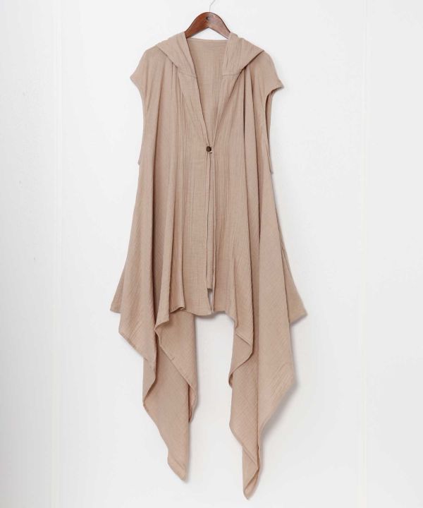 砂漠の民の装いをイメージした変形ベスト。フード付きで個性的なデザイン。ダブルガーゼ素材で軽やかに羽織れる一枚。通気性も抜群。