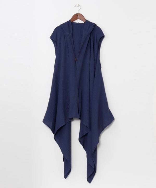 砂漠の民の装いをイメージした変形ベスト。フード付きで個性的なデザイン。ダブルガーゼ素材で軽やかに羽織れる一枚。通気性も抜群。