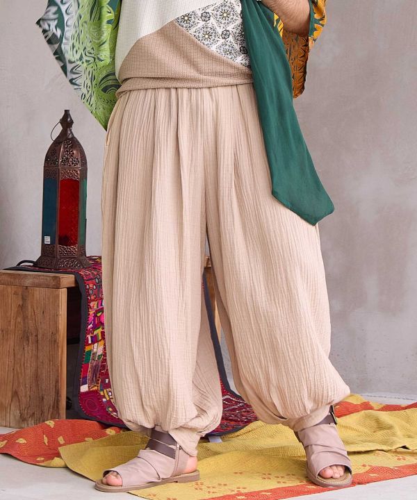 砂漠の民の装いをイメージしたダブルガーゼのバルーンパンツ。通気性がよく、裾は締め付けないカフス仕様でリラックススタイルに最適。