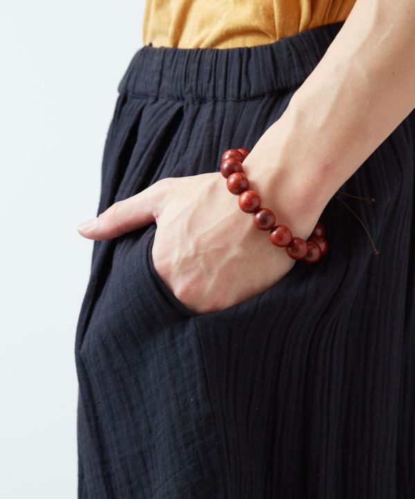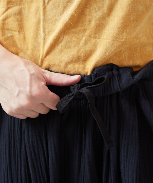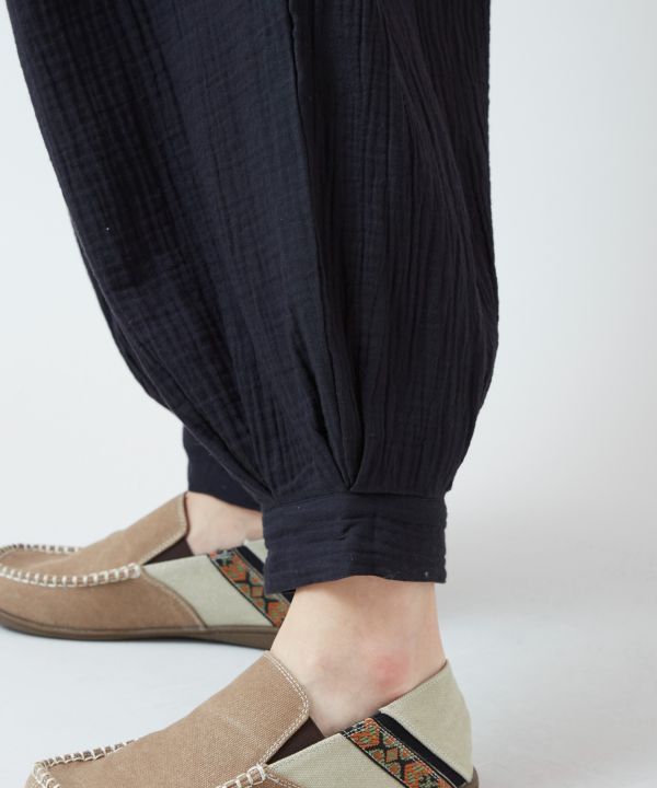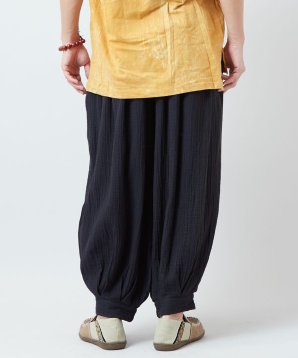 砂漠の民の装いをイメージしたダブルガーゼのバルーンパンツ。通気性がよく、裾は締め付けないカフス仕様でリラックススタイルに最適。