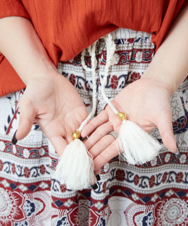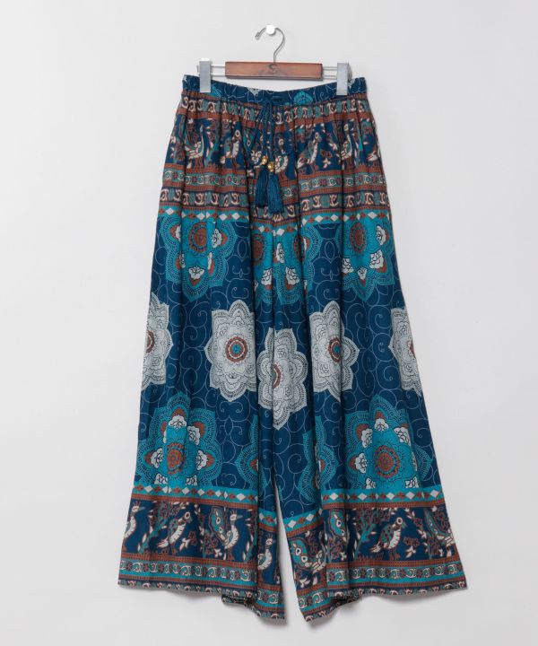 インド綿のさらっとした質感に大胆な曼荼羅プリントが映えるワイドパンツ。裏地付きで安心感あり。メタル付き外紐がアクセント。