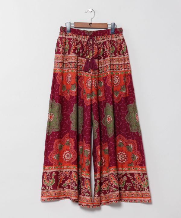 インド綿のさらっとした質感に大胆な曼荼羅プリントが映えるワイドパンツ。裏地付きで安心感あり。メタル付き外紐がアクセント。