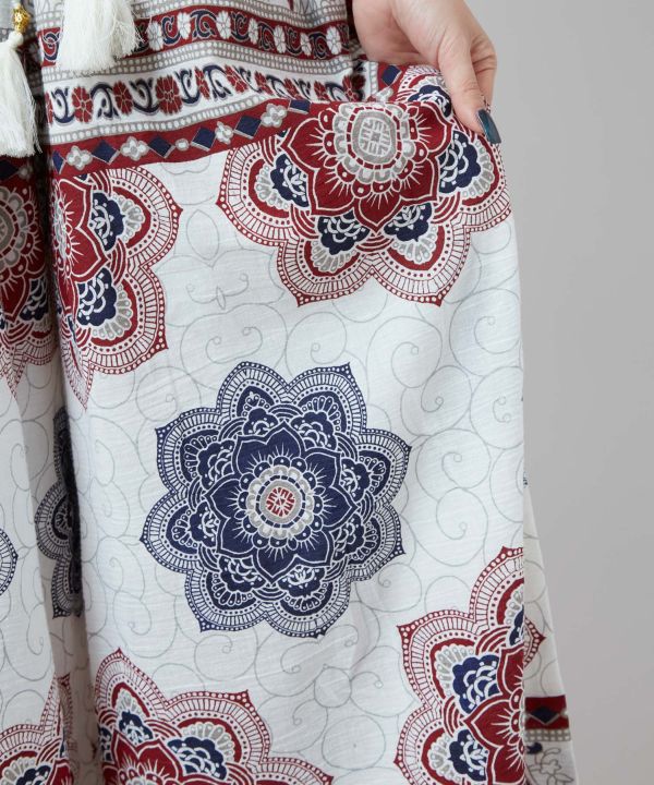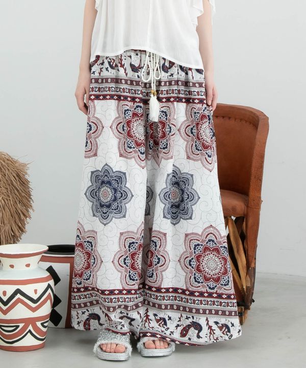 インド綿のさらっとした質感に大胆な曼荼羅プリントが映えるワイドパンツ。裏地付きで安心感あり。メタル付き外紐がアクセント。