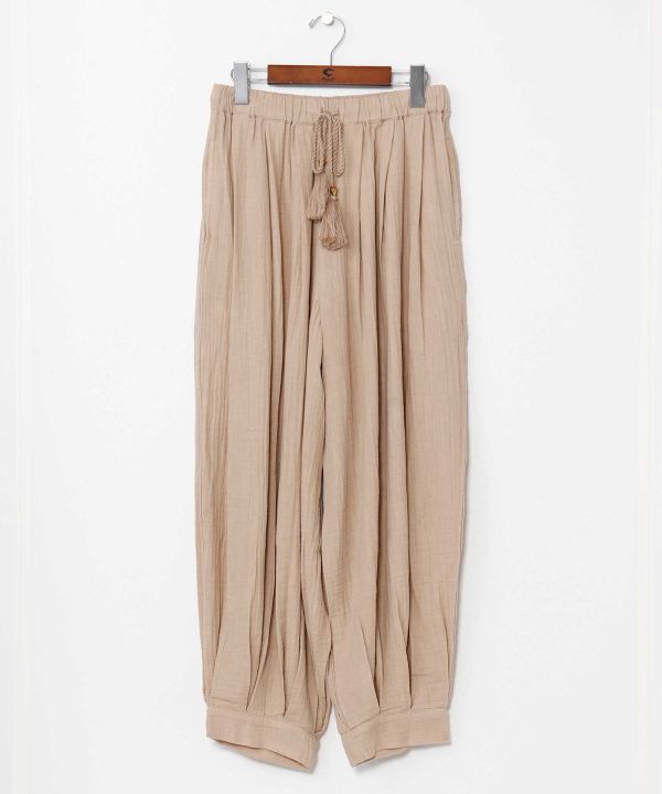 裾にメタルパーツ付きの紐がアクセントのバルーンパンツ。ダブルガーゼの柔らかい風合いと、ゆったりシルエットが魅力のアイテム。
