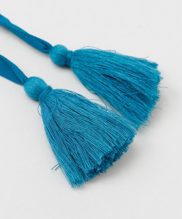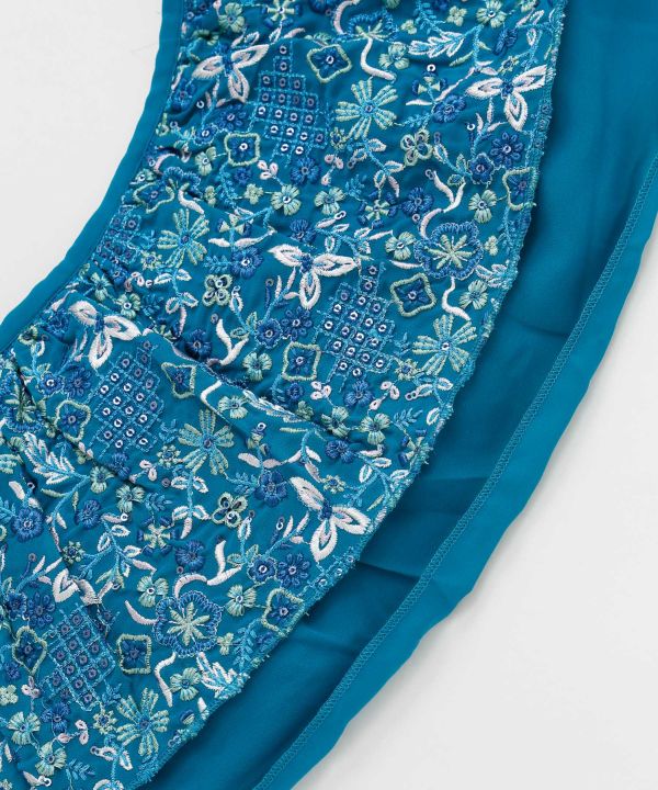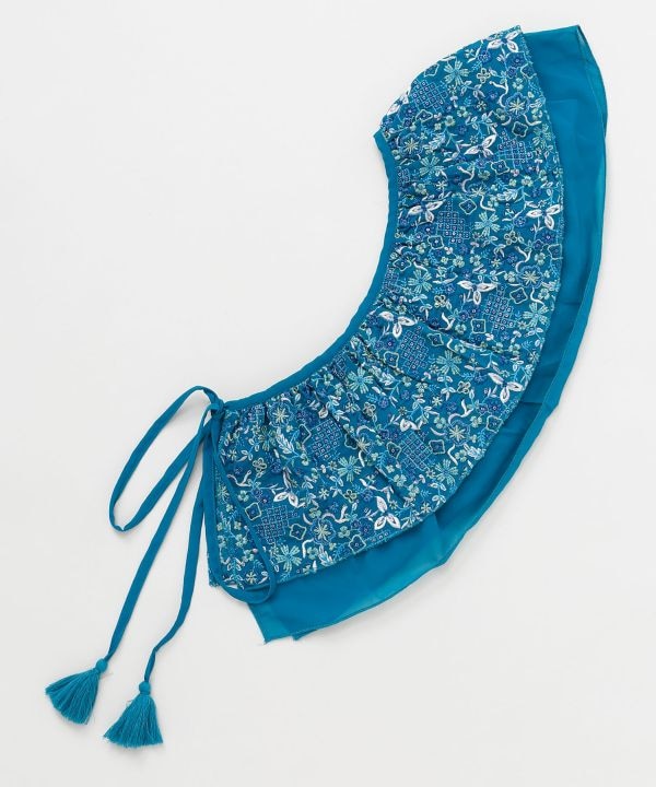 インドの伝統衣装サリーの煌びやかな布を贅沢に使用した付け襟ストール。花嫁衣装にも使われるスパンコール刺しゅうがきらめき、軽やかなシフォン素材が優雅な印象。腰や首に巻いて自在なアレンジを楽しめます。