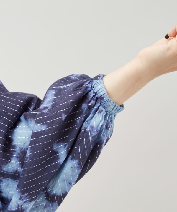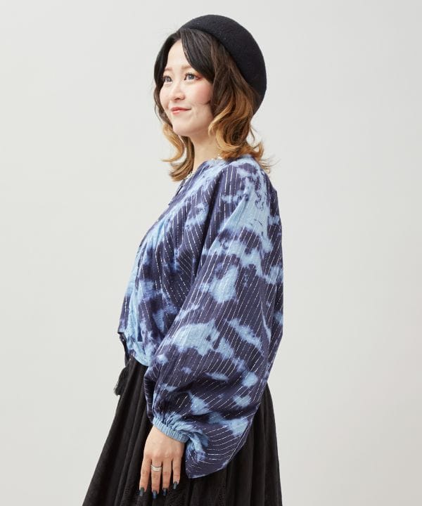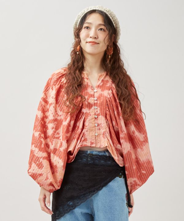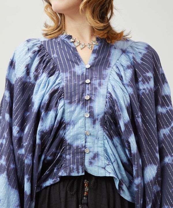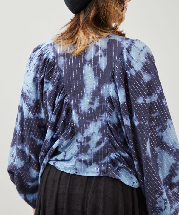 単色の濃淡とラメ糸の輝きが美しいタイダイトップス。ボリューム袖と短丈のシルエットが目を惹くデザイン。柔らかなインド綿にラメ糸を織り込んだ生地で華やかな印象に。