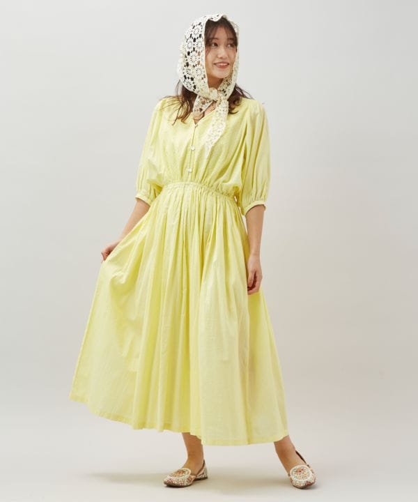 インド綿のやさしい風合いに控えめな刺しゅうを添えたワンピース。スタイルアップを演出するシルエット。シャーベットカラーでコーデを華やかな印象に。
